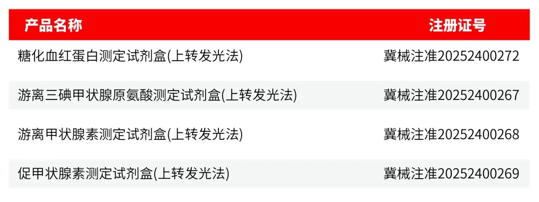 近日,凯发k8一触即发基于上转发光(UPT)技术的 4 项医疗器械产品,成功拿下国家药监局《医疗器械注册证》!此次获批的甲功三项(FT3、FT4、TSH)与糖化血红蛋白检测项目,不仅是公司技术实力的权威认证,更将为临床诊疗与慢性病管理带来便捷新选择。